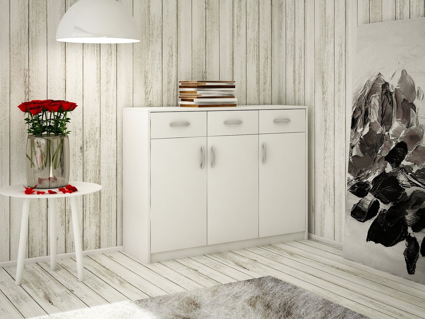 Niezależnie od tego i niezależnie, czy komoda stanie w salonie, kuchni czy sypialni, poradzi sobie znakomicie. Jest zbudowana z płyty laminowanej o grubości 16mm, która przetrwa lata użytkowania, upychania ubrań, obrusów, sprzętu RTV czy dokumentów. Zadba o to solidna konstrukcja, która nie ugnie się pod ciężarem, nawet gdy wejdziesz na komodę, by zawiesić firanki.