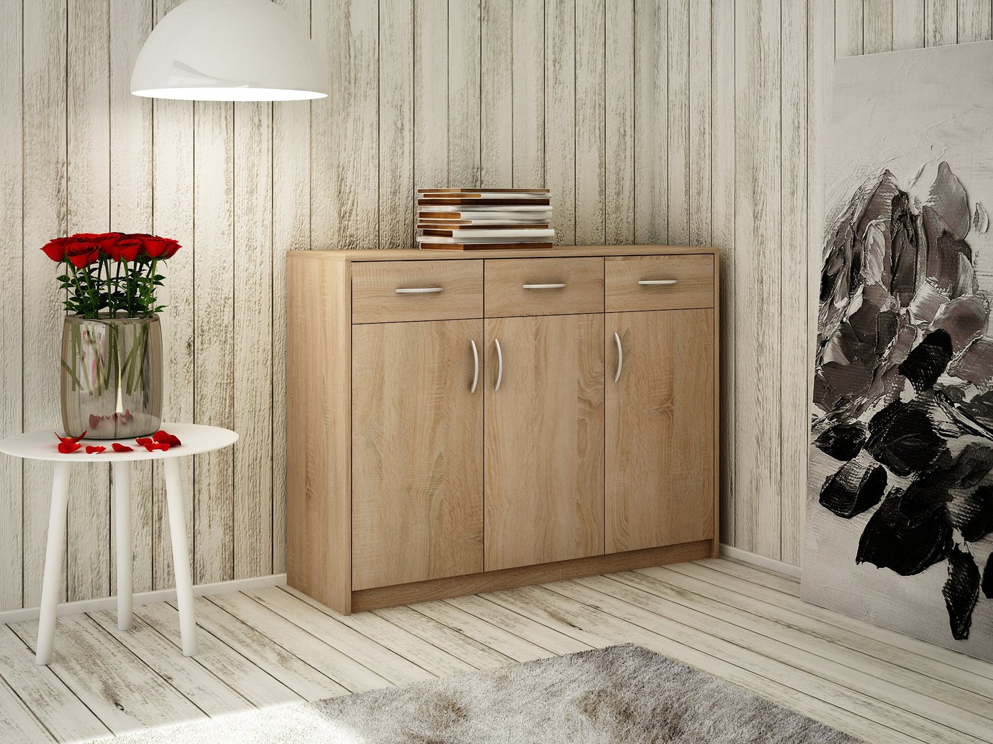 Komoda Potrójny szyk wskazuje na nowoczesne podejście do elegancji i prostoty. Opowiada historię przez sposób, w jaki z niej korzystasz.
